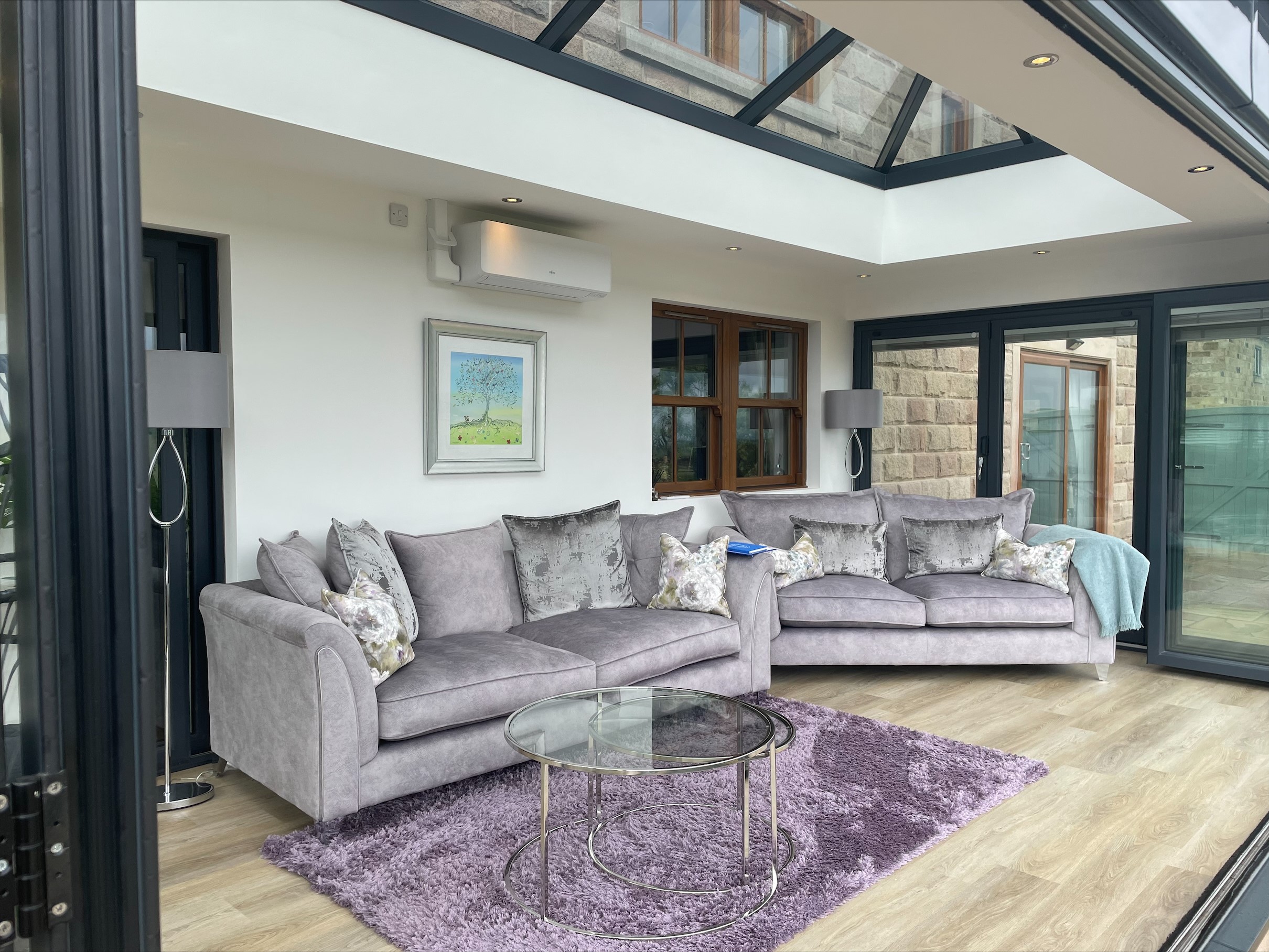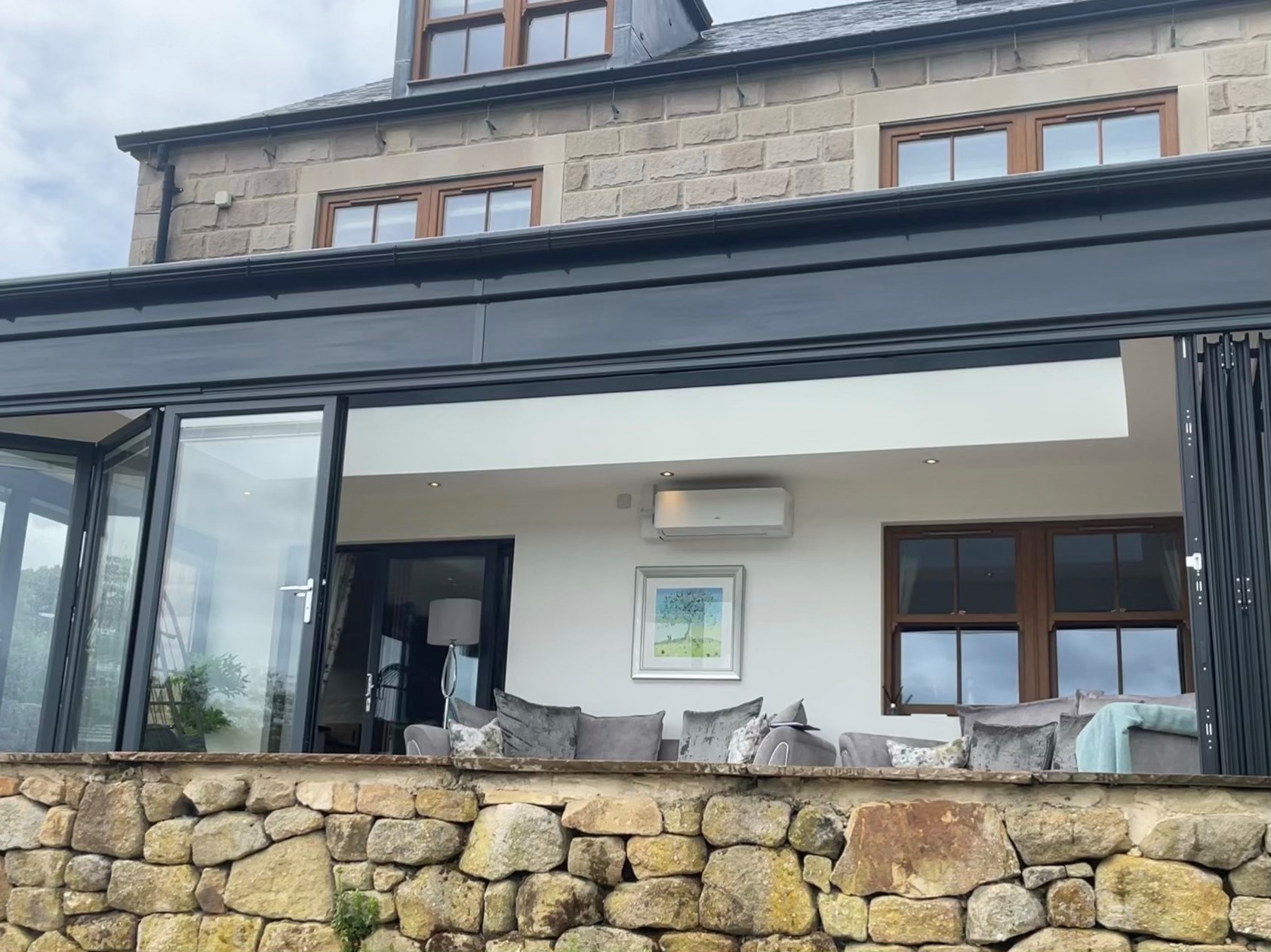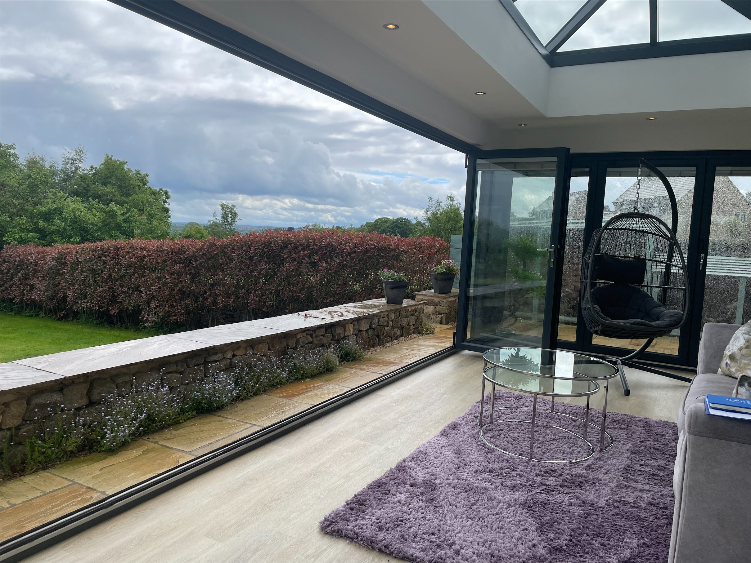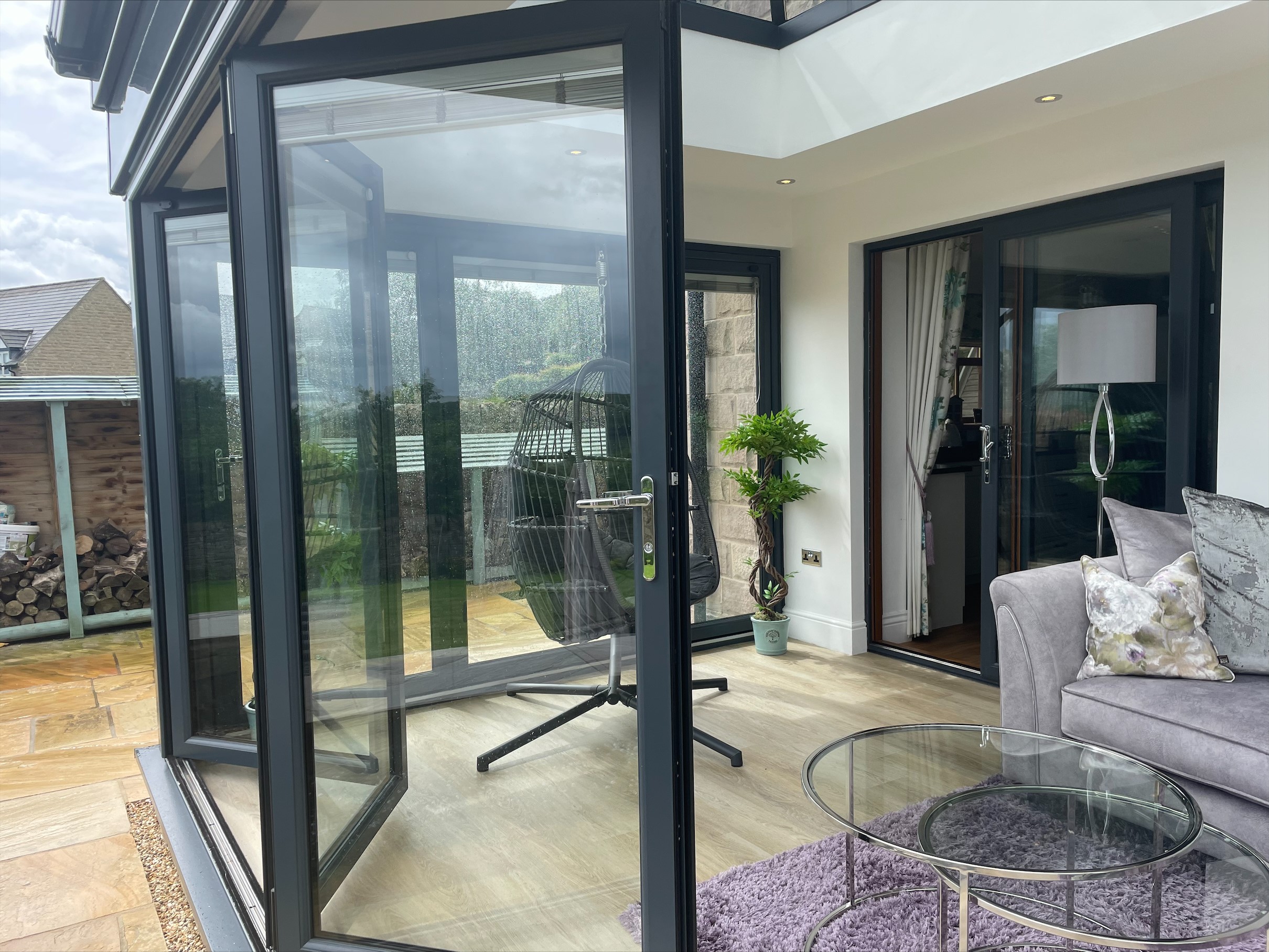 This new orangery in Crich, Derbyshire is a project that added a modern extension to the rear of the house giving the customer a getaway space to sit and relax whilst enjoying the views beyond their garden. This Orangery includes our Liniar Alumina Bi-Fold doors that follow the build all the way around. This allows the customer to feel as though they are sat in their garden rather than inside. Within the Bi-Fold glass units are internal blinds which are essential for them sunny days. All frames are fabricated within our factory based in Ilkeston which are all supplied by Liniar in the colour Anthracite Grey. This colour complements the pale brick used on the base of the build which matches the brick of the house. After the installation was completed, our customer purchased an air conditioning unit which he has now informed us that he hardly uses as the heat of the sun keeps the room warm and the opening of the Bi-Folds allows a cool breeze to enter when required. He also spoke of how they considered under floor heating but was soon to realize this was unnecessary as the sun keeps the floor warm through out. Overall, the customer was pleased with his Orangery and that is was everything that they expected for it